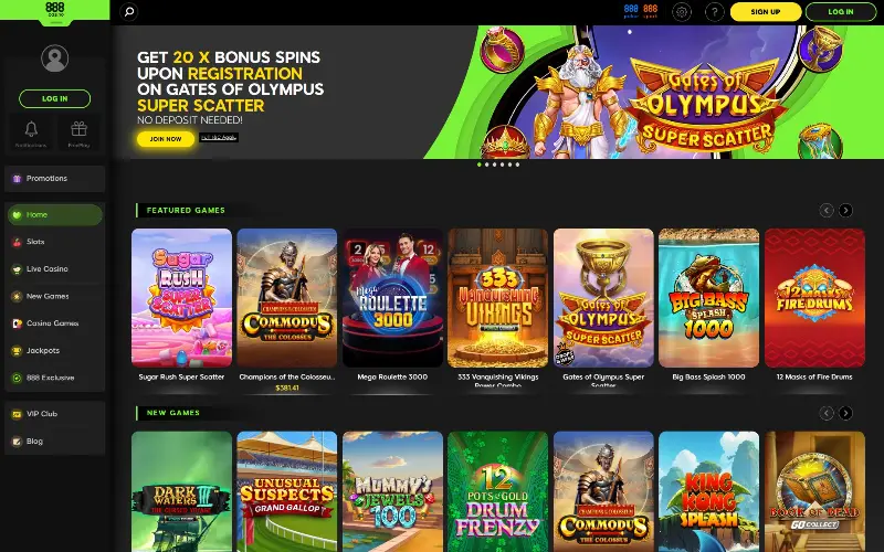 - Apmeklējiet 888casino.com un klikšķiniet uz “Sign Up” (Reģistrēties) augšējā labajā stūrī.